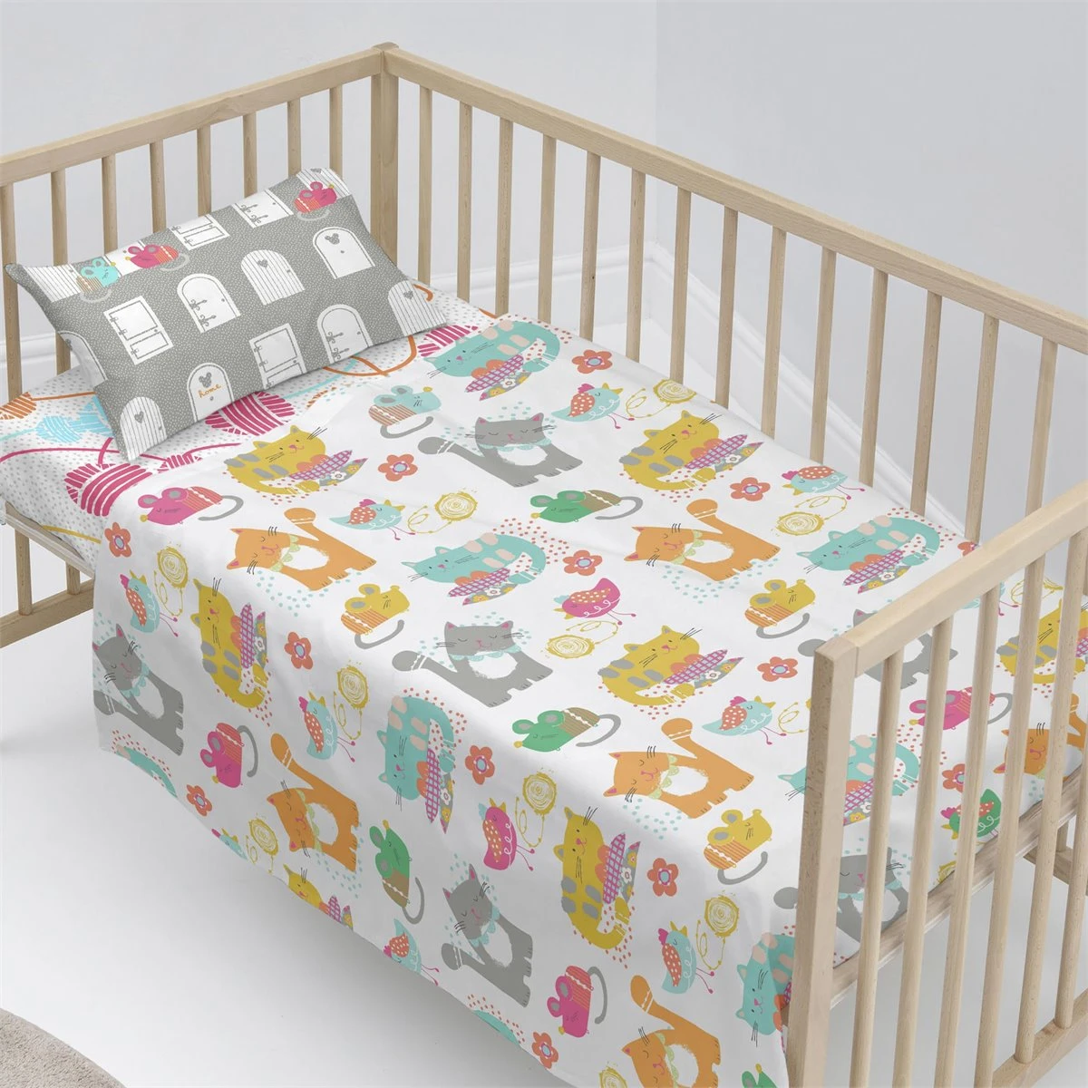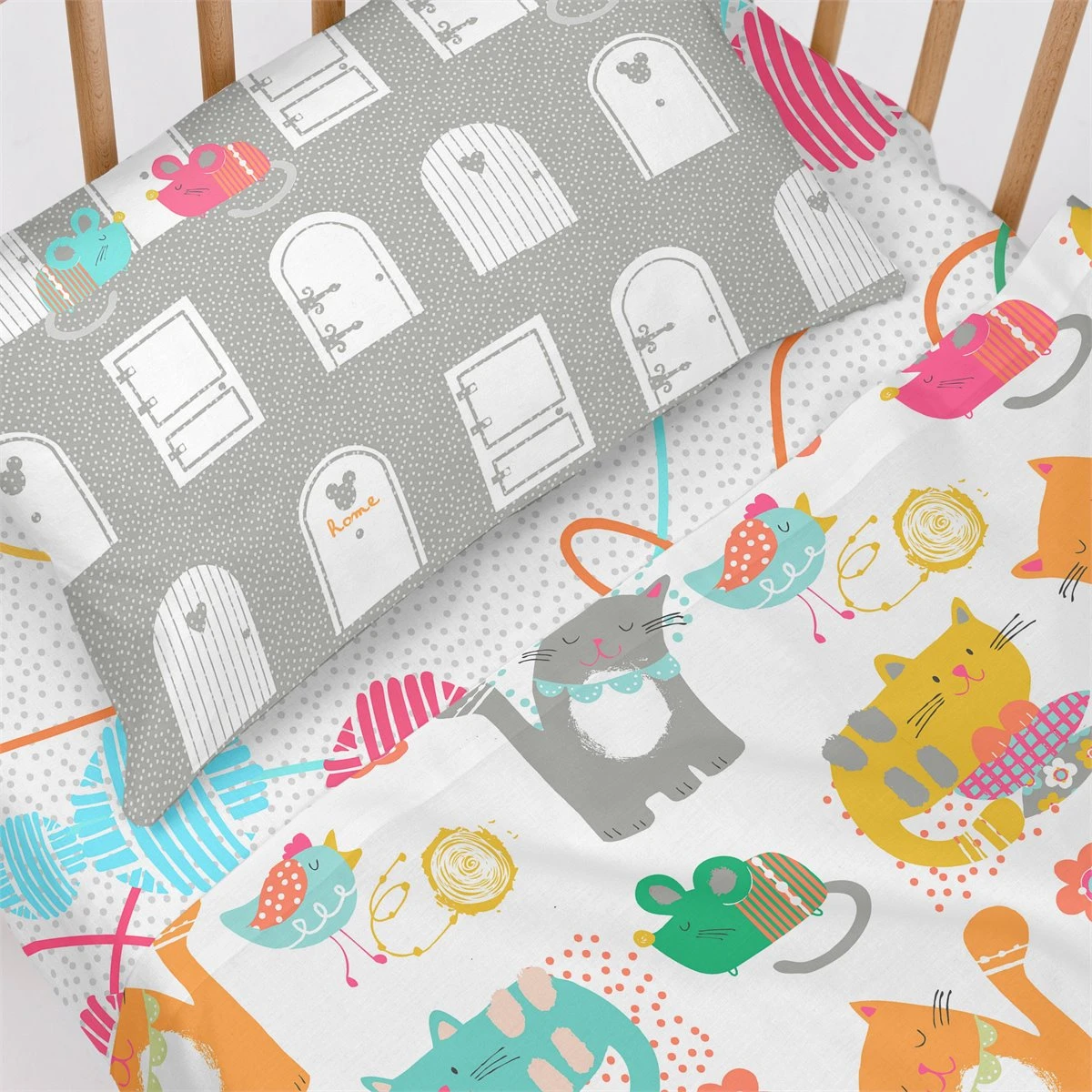 Es hora de jugar con los coloridos y divertidos animales de la sábana Cat & Mouse de la colección Moshi Moshi. No hay mejor manera de hacer buenos amigos que diviertiéndose.Esta suave y ligera sábana de algodón 100% viene con una funda de almohada estampada y se puede mezclar y combinar con otros productos de la misma colección.No incluye bajeraDisponible en las siguientes tallas: * 100×130 [ Cuna ] (incluye funda de almohada estampada 50×30. * 120×180 [ Maxicuna ] (incluye funda de almohada estampada 40×60.