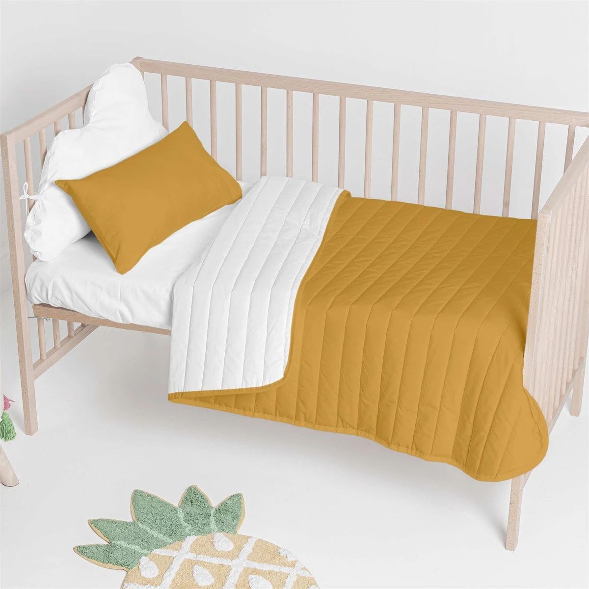 Colcha reversible de dos colores y confeccionada con un biés coordinado. Acolchado en forma de rayas. Anverso y reverso 100% Algodón con acabado suave. Ideal para entretiempo. El relleno es 100% poliéster de fibra hueca siliconada de 100 Gramos. Fabricado en España. ¡Combínalo con otros artículos de su familia! Incluye: – 1 x Colcha colcha 100×130 [Cuna].