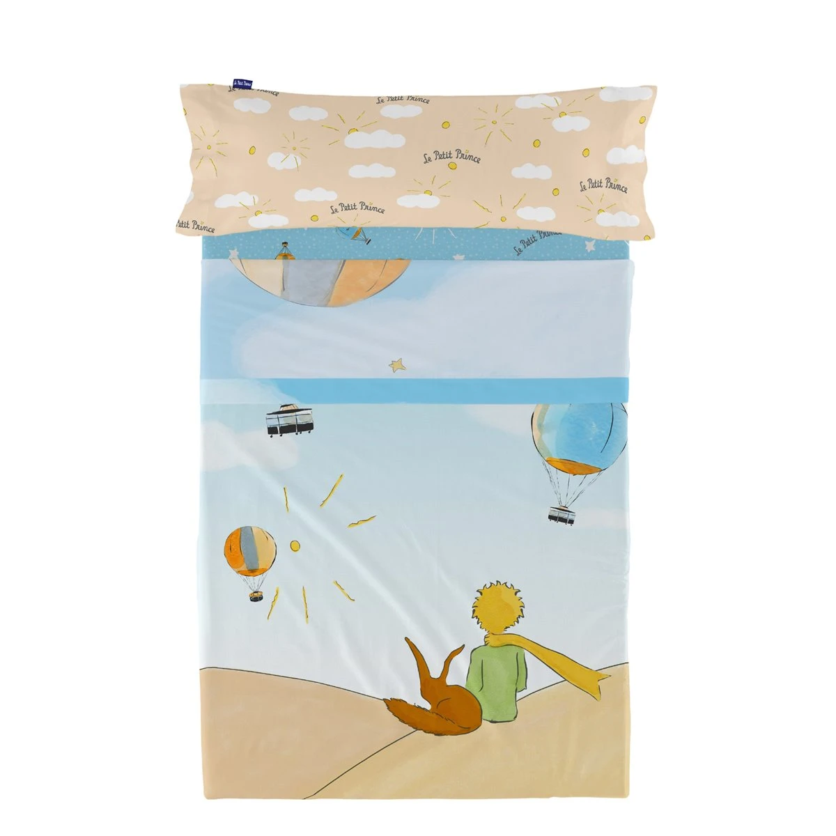 Cuando cubres a tu hijo cada noche con la sábana Montgolfiere de la colección Le Petit Prince, su habitación se convierte en un mundo de aventuras en el que los globos aerostáticos le llevan a sus sueños, con destino desconocido. Tendrá que esperar hasta la mañana para descubrirlo.Esta sábana ligera y transpirable de algodón 100% de 150 hilos ofrece un tacto suave y reconfortante, y la estampación digital de alta definición proporciona colores vivos que se mantienen a lo largo del tiempo, el uso y los lavados.Disponible en las siguientes tallas: * 160×270 [Cama 80/90](incluye funda de almohada 45×110. * 180×270 [Cama 105] (incluye funda de almohada 45×125.